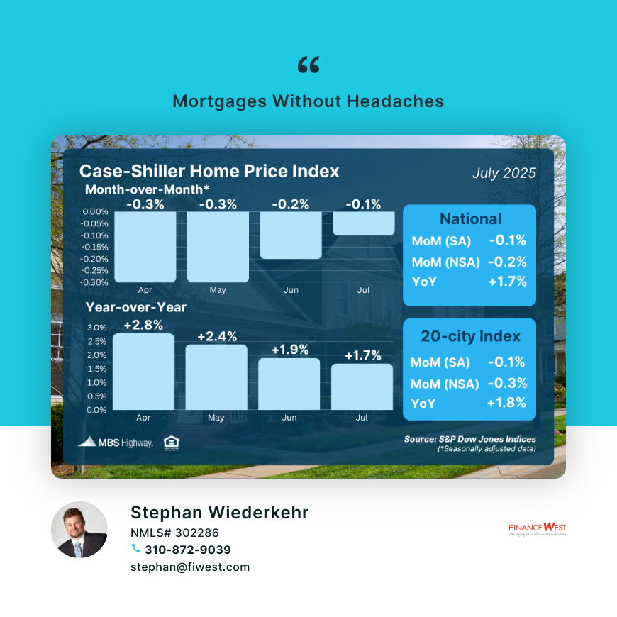 From June to July, U.S. home values slipped 0.2% before seasonal adjustment and 0.1% after adjusting for seasonality. Compared to a year ago, prices are still up 1.7%.