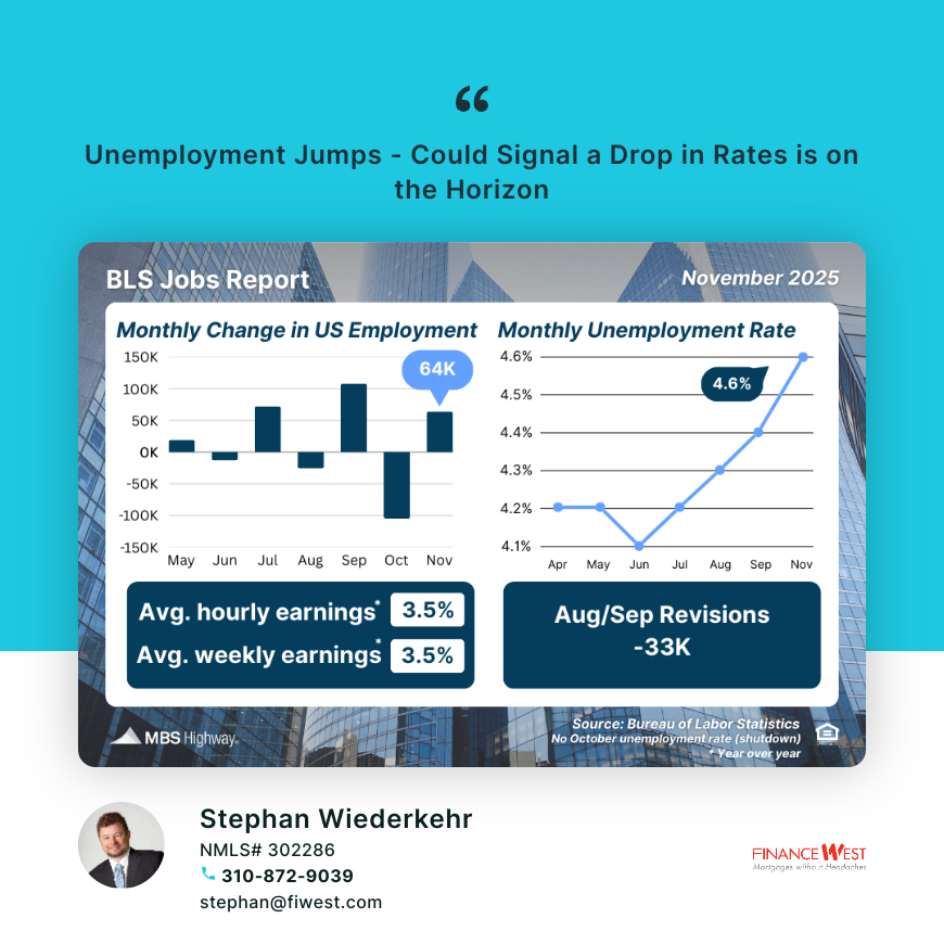 Dec 16 2025. Week Employment Numbers could lead to finally lower mortgage rates. Why? Because a weak economy signals primarily that inflation could come down, as consumer spending would cut down on spending. Secondarily, it would force the Fed to take measure to stimulate the economy. The Fed is walking a fine line because if they stimulate it could actually raise inflation.